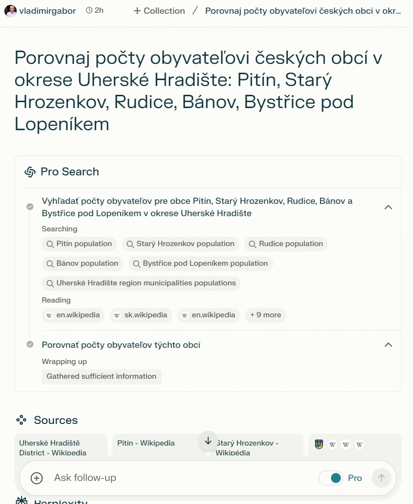 Robím cenovú analýzu, ale priamo v Hrozenkove nič na predaj nie je, takže sa nemám čoho chytiť. Musím teda preskúmať širšie okolie, podobné obce, ponuky v nich a na základe toho odhadnúť predajnú cenu domu. Namiesto pracného hľadania informácií o jednotlivých obciach v okolí napíšem komplexnejší prompt a priamo na obrázku vidieť ako Perplexity samé vytvorilo podotázky a hľadalo informácie jednotlivo: